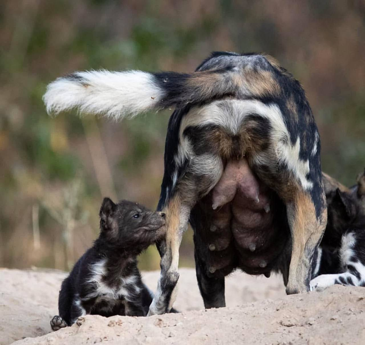 Пятнистый (расписной) волчонок впервые вышел из логова, чтобы покормиться, а это значит, что ему три недели. А в пять он будет есть мясо, которое ему отрыгнут старшие... Рядом со щенком мама, естественно. Её тоже покормят отрыгнутым мясом пришедшие с охоты родные и близкие. Хороший способ, к слову - сам поел, что-то переварил, поделился - уже в слегка ферментированном виде. К слову, у малыша примерно 9 братьев и сестёр, а мама, скорее всего, старшая самка в стае гиеновидных собак. Его сёстры подрастут и уйдут, а вот братья - останутся.