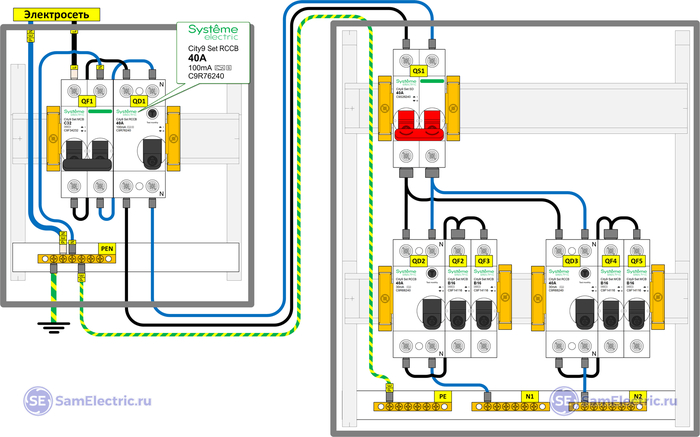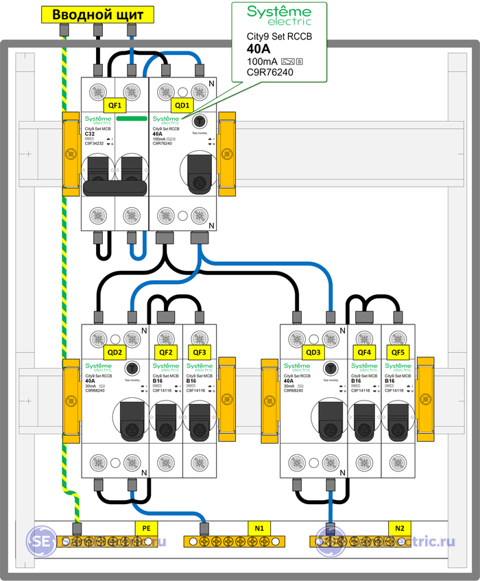 Для того, чтобы выжать максимум из противопожарной функции вводного ВДТ, он должен быть установлен не в домашнем щитке, показанном на схеме. Его нужно ставить во вводном щите – как можно ближе к источнику питания (прибору учёта) – на опоре, трубостойке или на фасаде.