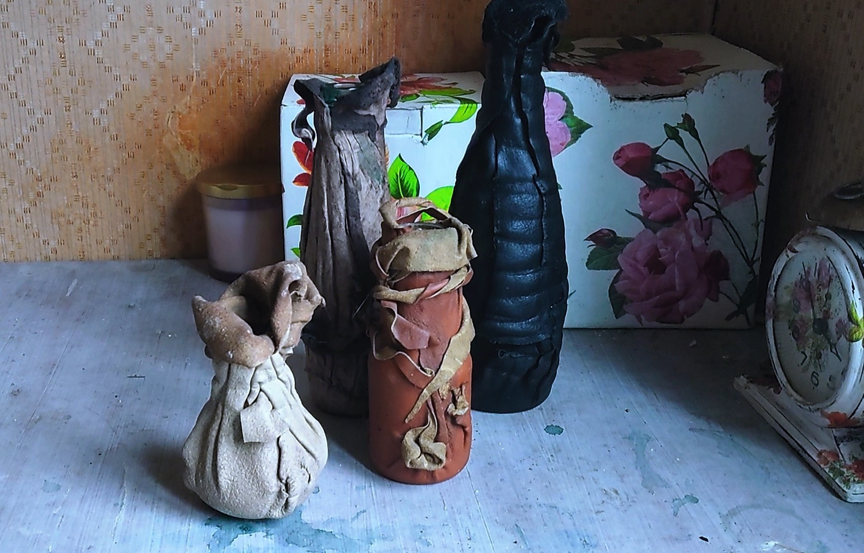 А далее, обтягиваем бутылку этой кожей, фиксируя веревкой. Различные складочки приветствуются, т.к. они будут служить элементом декора.
