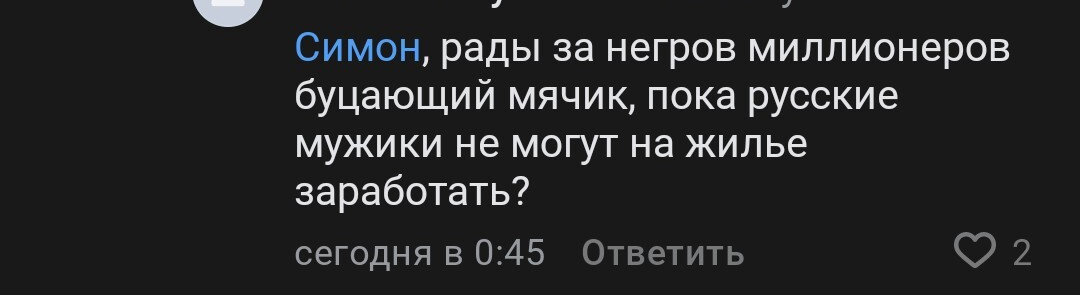 И у меня вот возник вопрос ко всем этим ребятам (особенно к челику, который переживает что "русский мужик не может ипотеку заплатить а негры миллионы гребут"): парни, а что Вам мешает взять и поднять футбол? Вы никогда не задумывались, что русских иак мало в команде, потому что ВЫ не развиваете русский футбол? Русский спорт.