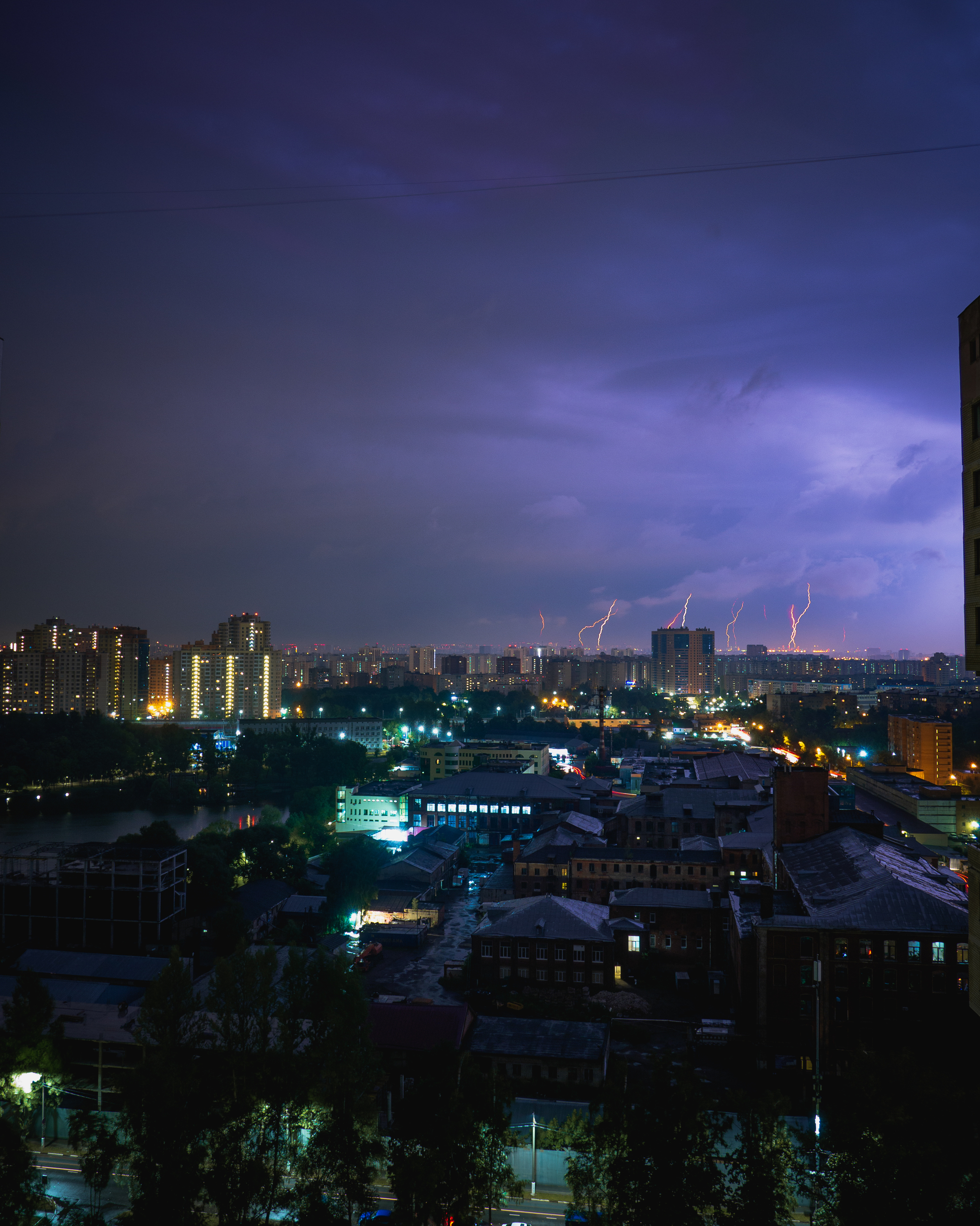 Окна на Лосиный остров, било прям по деревьям. Красиво было. Хотел в 2 часа спать лечь, но услышал гром. Открыл карту молний, увидел что их тьма и идут ко мне. До полчетвертого ловил молнии)