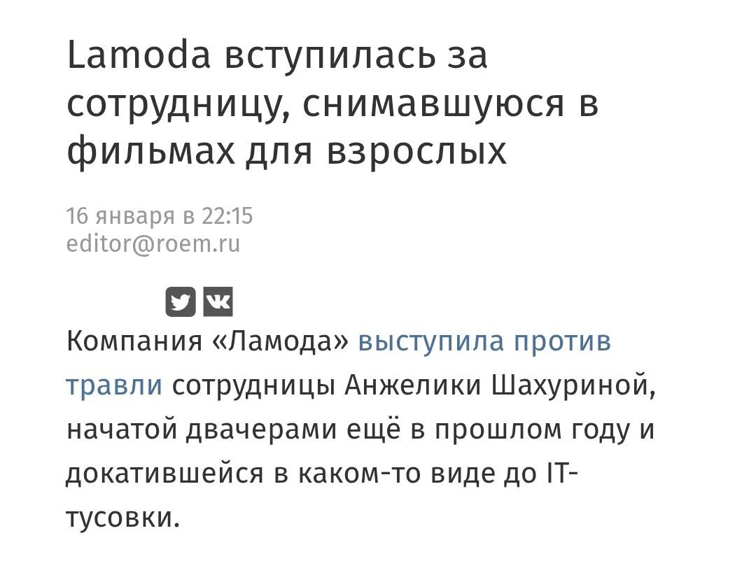 Ну и карьерная новость №1 на сегодня: тим лид продуктовой аналитики в Lamoda Tech Анжелика Шахурина стала порноакртисой под ником Lika Blackberry. Точнее она ей была, просто об этом никто не знал, а сейчас узнали. А Lamoda Tech зачем-то начал удалять все посты с упоминанием Анжелики, хотя могли бы наоборот поддержать, зарплату повысить, накинуть новый функционал по организации тим билдингов, или еще как-то...