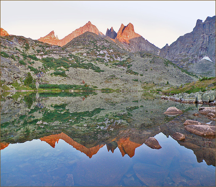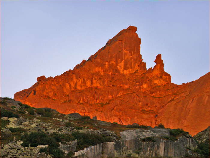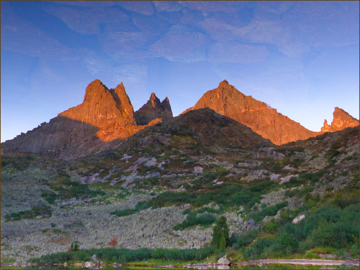 Как правило, туристы видят эти озёра в двух случаях: когда бегают сюда в радиалку и когда идут через перевал Пикантный. Получается днём и слишком быстро. А если на Цветных заночевать? Тогда можно увидеть совсем другие картинки... Пик Зуб Дракона окрашивается в тёплые тона и отражается в озере: