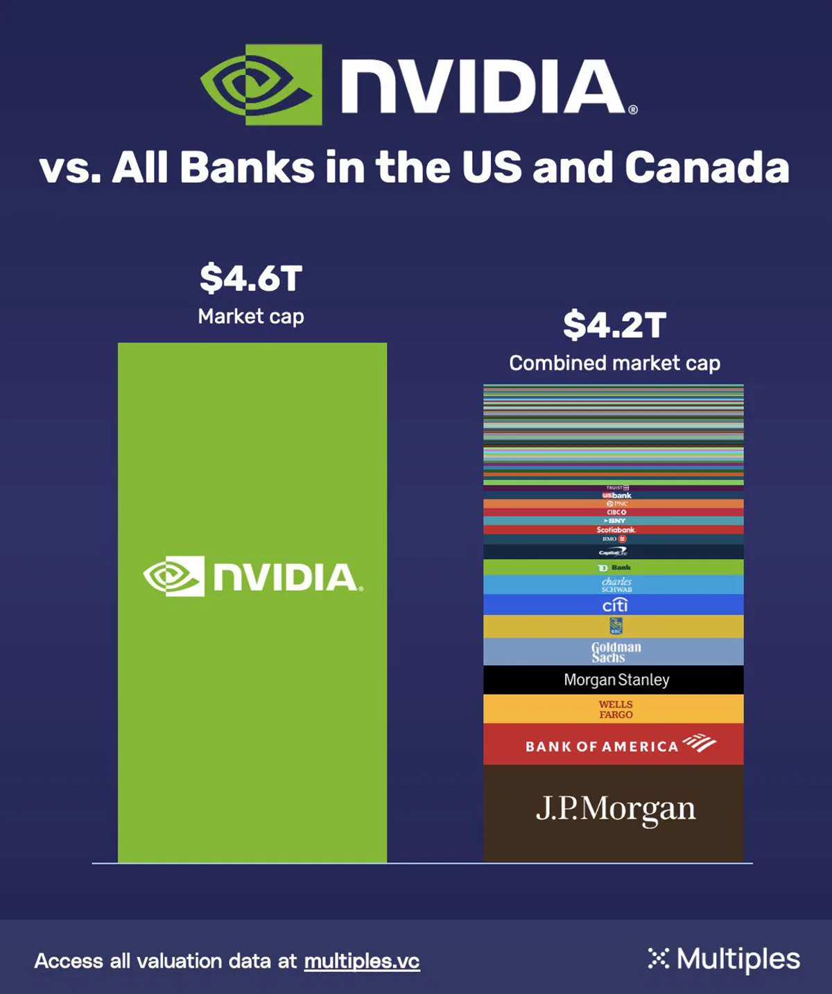 На иллюстрации сравнивается капитализация Nvidia и совокупная капитализация всех банков США и Канады.