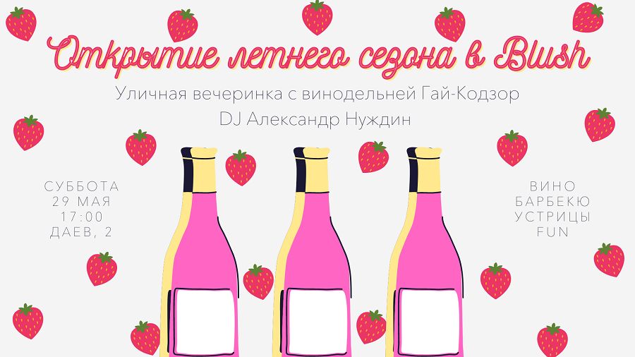 Blush и винодельня Гай-Кодзор приглашают нас 29 мая на вечеринку. Под открытым небом в Даевом переулке будет всё - вино, сыры, барбекю, устрицы, фрукты, шоколад и летний вайб. Вход свободный начало в 17:00.