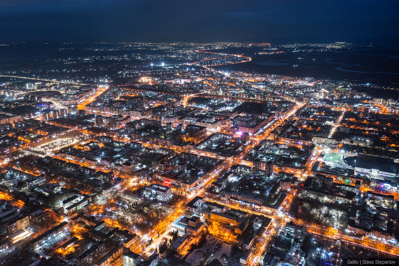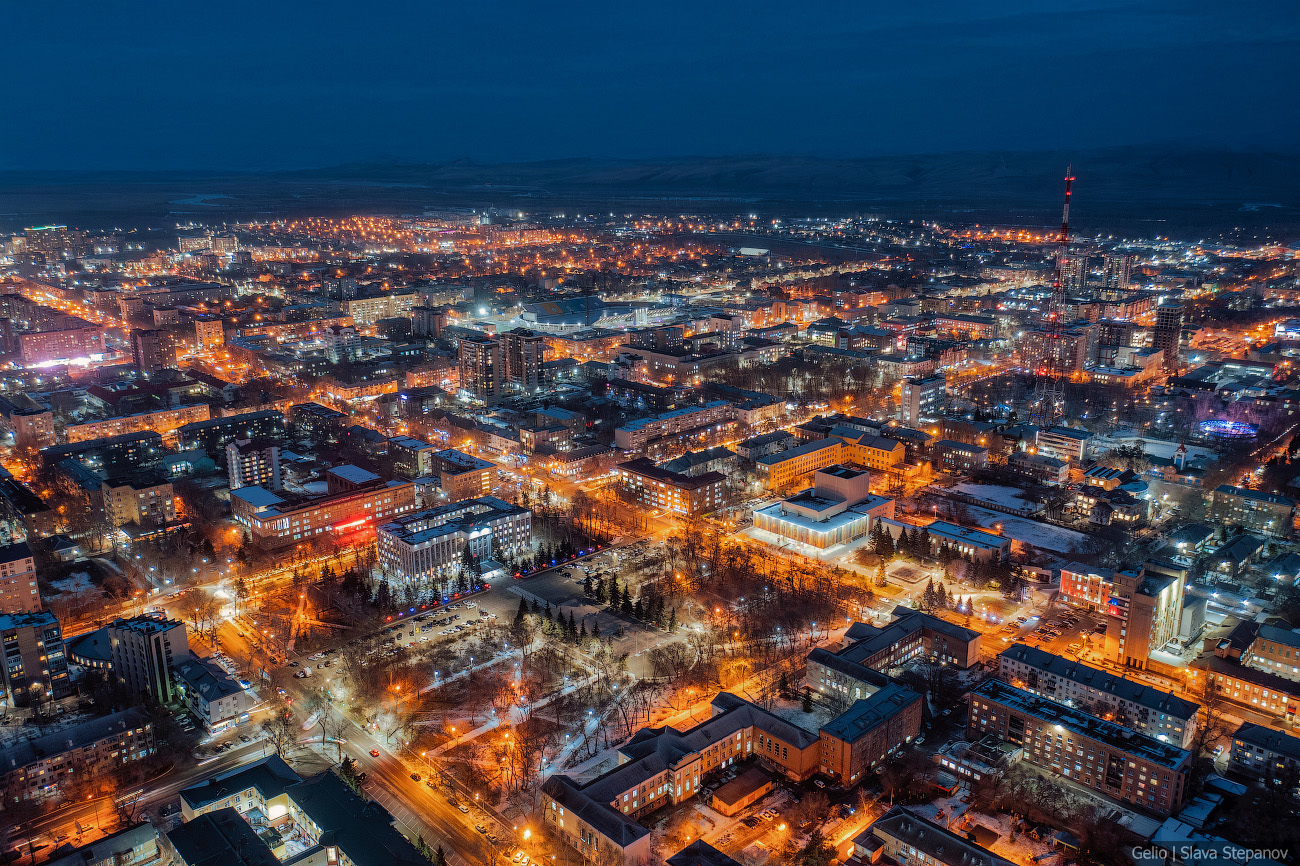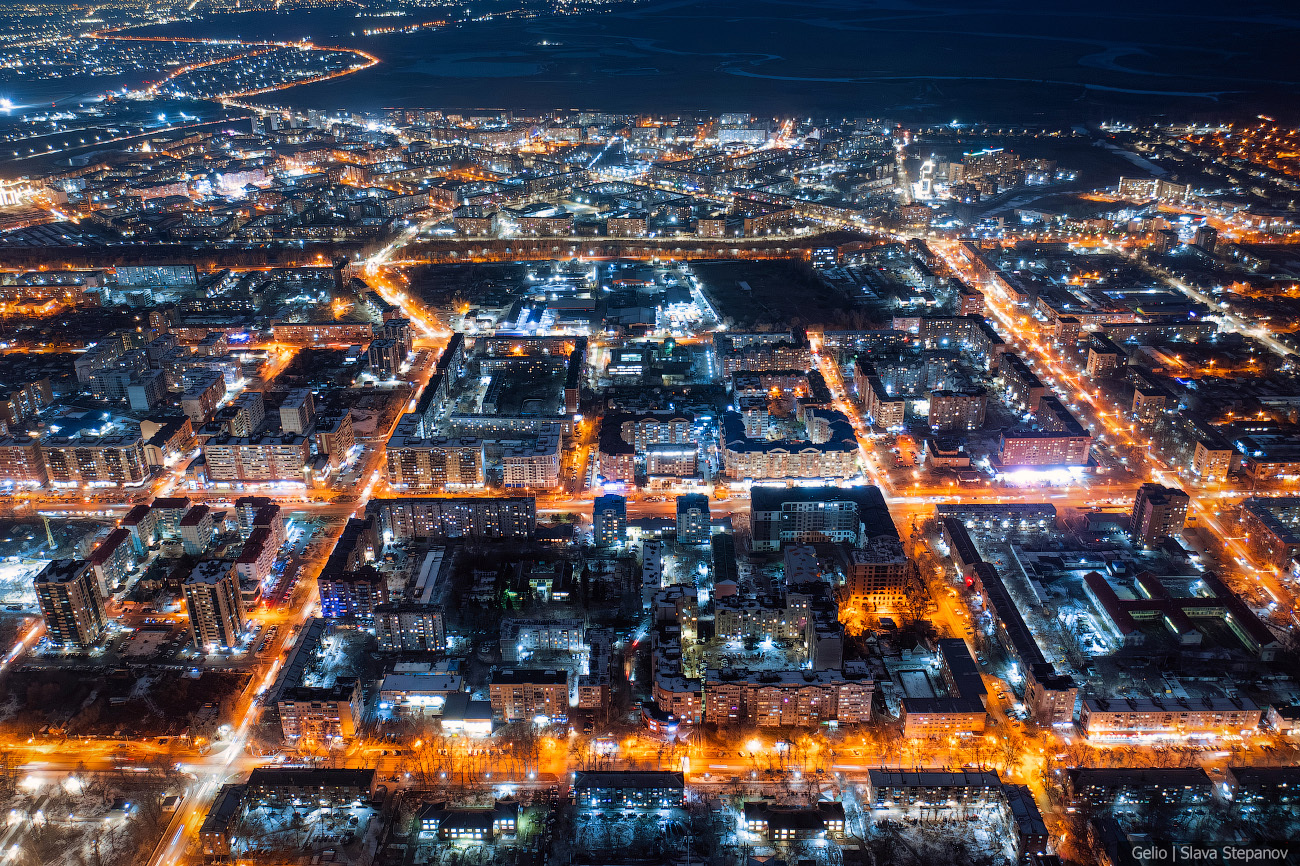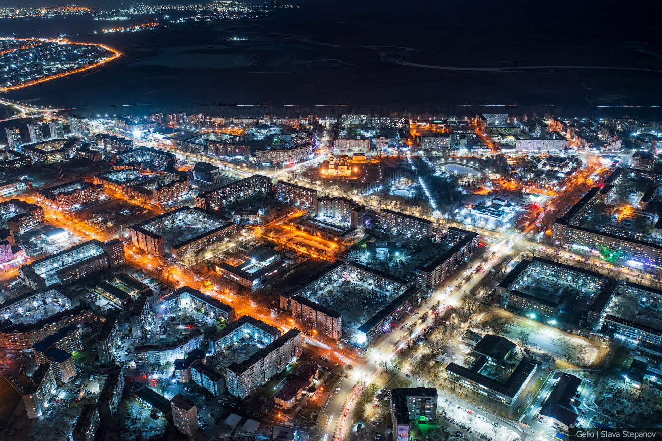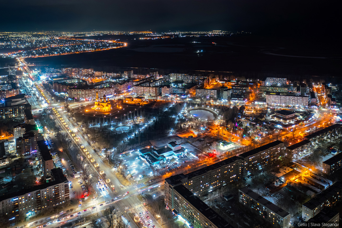 13. Абакан постепенно растёт, появляются новые здания. Сейчас это 99-й по численности город страны — здесь живёт более 180 тысяч человек, примерно треть населения республики. С высоты, а особенно при вечернем освещении улиц, хорошо видна структура застройки, новые жилые кварталы и связь исторического центра с современными районами.