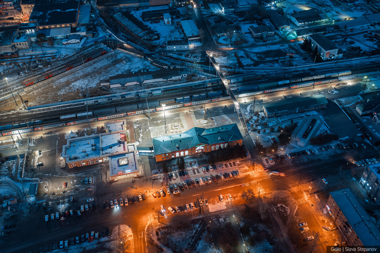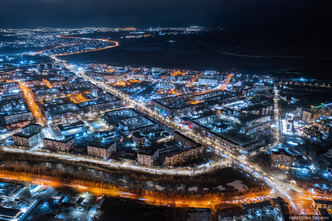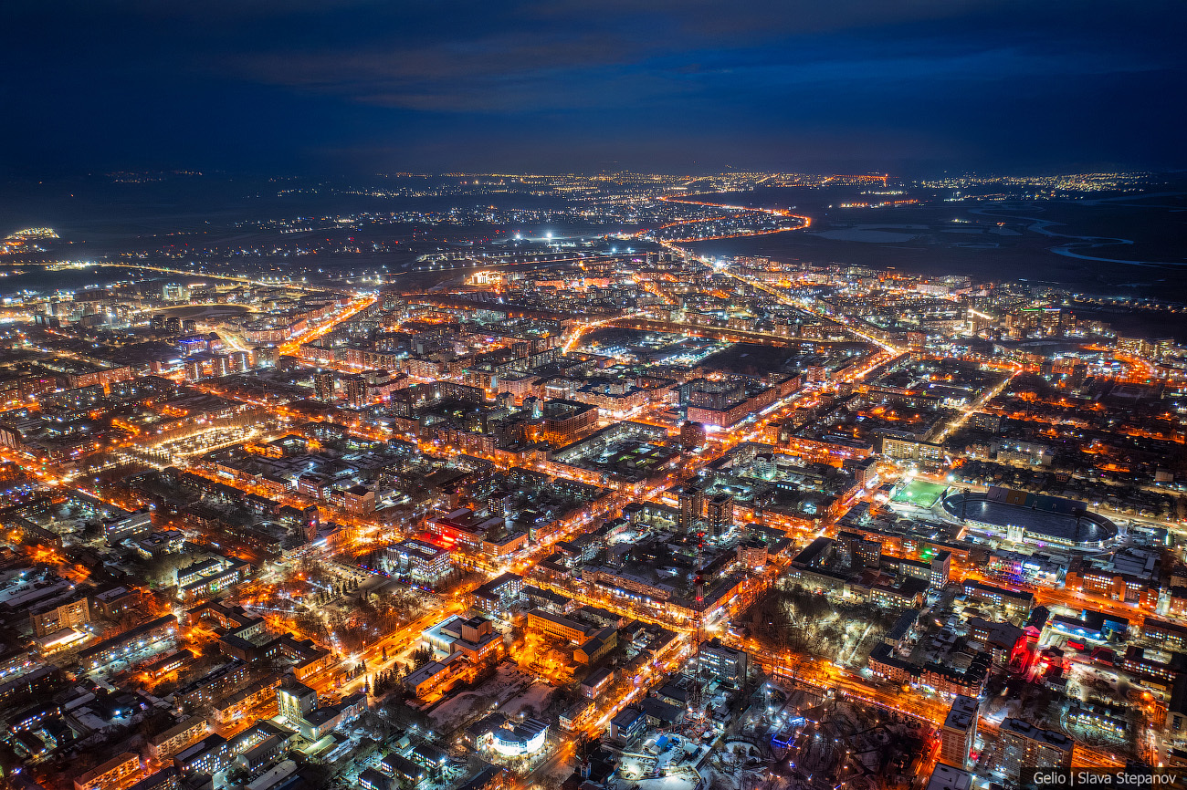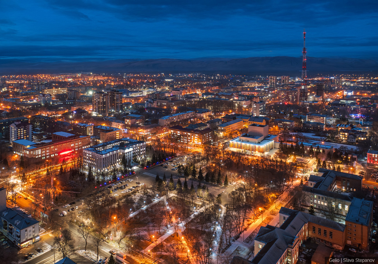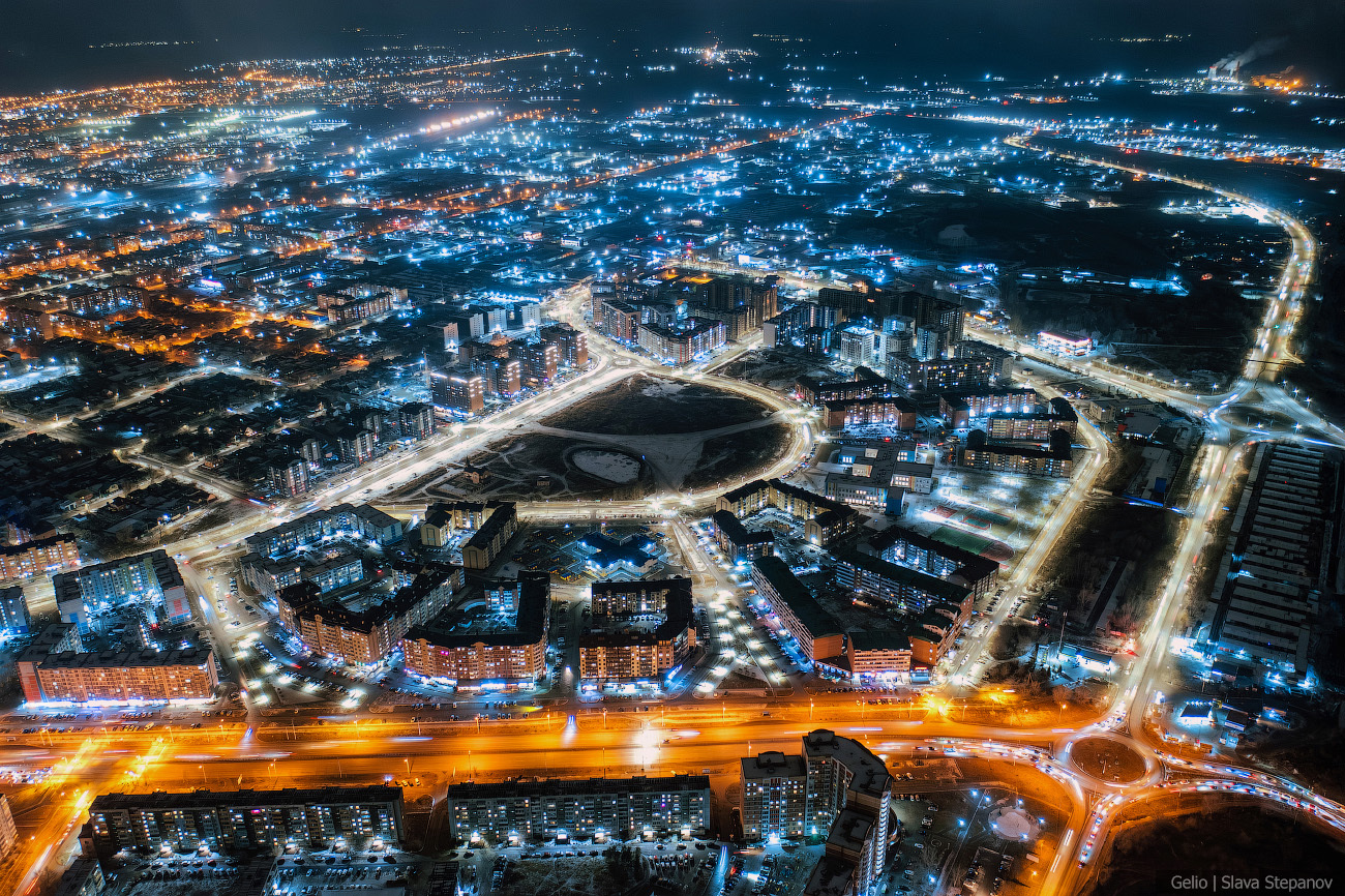 13. Абакан постепенно растёт, появляются новые здания. Сейчас это 99-й по численности город страны — здесь живёт более 180 тысяч человек, примерно треть населения республики. С высоты, а особенно при вечернем освещении улиц, хорошо видна структура застройки, новые жилые кварталы и связь исторического центра с современными районами.