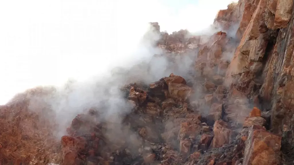 Кроме того, что из расщелин в скалах вырываются струйки дыма от горящего сланца, процесс сопровождается странными звуками, а ландшафт усеян рубиново-красными лужами чудовищно кислой воды. И в довершение всего над холмами стоит удушающий запах серы, совсем как в аду.