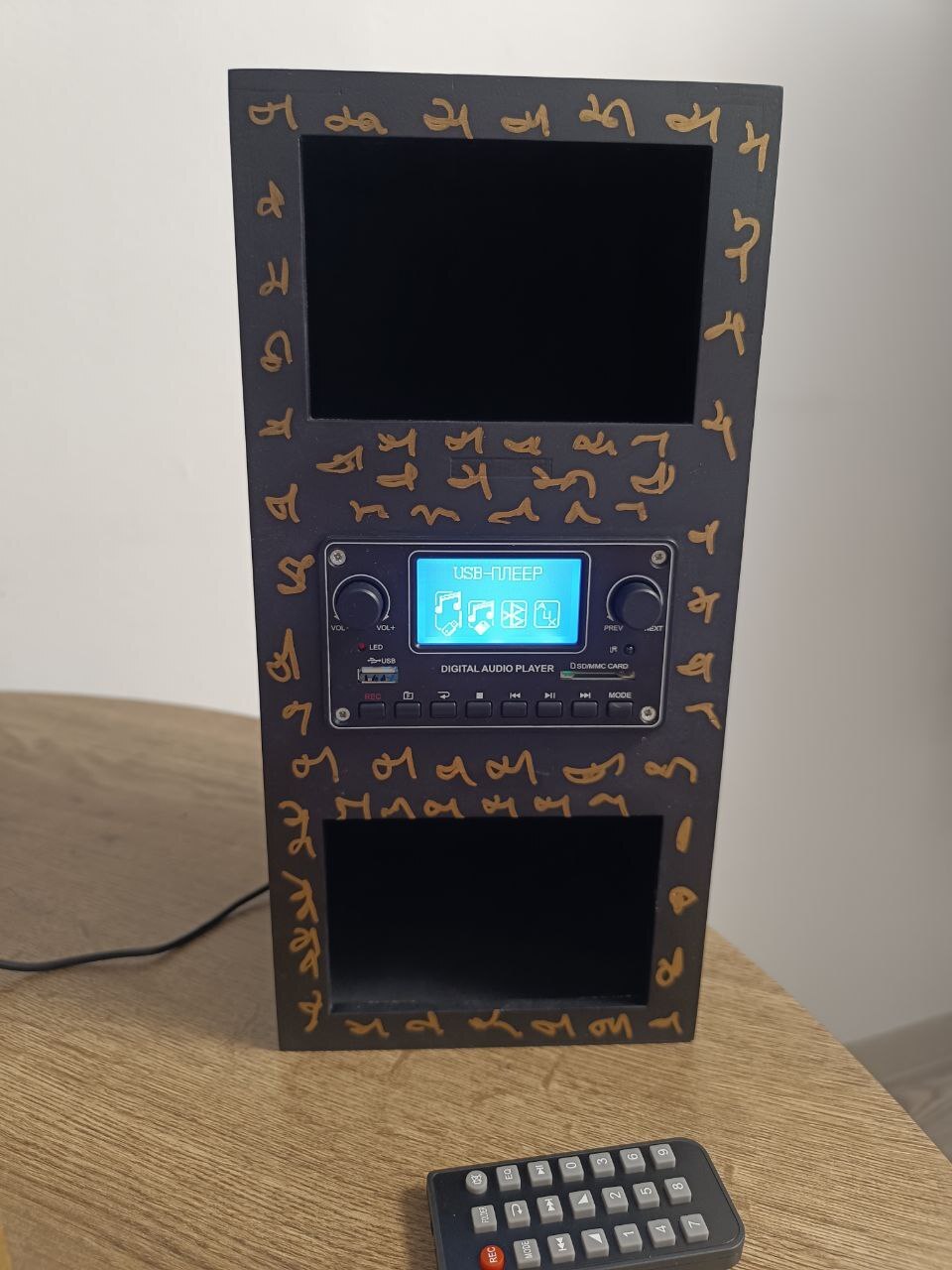 Еще по поводу плееров, обратите внимание на плеер на фото, это новые варианты плееров. Мы ранее говорили, что они русский не поддерживают, что название файлов на русском как вопросики отображаются. Оказывается, они поддерживают. Нужно зайти в меню и выбрать русский язык (как это сделать сообщат в группу Гефест). Эти плееры позволяют проигрывать папки. Вы закачали нужные файлы и поставили проигрывать всю папку, если нужно. Дальше мы еще думаем над тем, как Алису научить управлять нормально этими плеерами. Скажем, я дома говорю: «Алиса, включи Маат или Зевса, или Гелиос», и она включает и выключает по команде. Но играет то, что там уже стоит. Она не умеет ставить нужные треки, а было бы удобно говорить ей что включить на каком приборе. Кстати, насчёт Зевса, вот вам еще такая идея. Вы поставили программу, скажем «защиту» на нем, записали на флешку. Подключили через умную розетку. И дальше вы что-то делаете не дома. И вам срочно понадобилась защита, что-то такое почувствовали. А времени колдовать нет, не получается нормально поработать, скажем, вы на мероприятии сидите. А на коленке ставить защиту довольно не просто. Любая работа должна делаться в рабочем состоянии, в кабинете. А вы не можете отвлечься сейчас. Вы просто через телефон, через умный дом говорите либо голосом: «Алиса, включи Зевса», либо кнопку вывели на экран и нажали, и запустится защита на вас. Правда заранее должен ваш вольт лежать в машине. Ну, такие заготовки можно сделать, сами подумайте на какие темы. В общем о Ведьмином котле все рассказал, надеюсь понятно, что это за машина и как ее можно использовать.