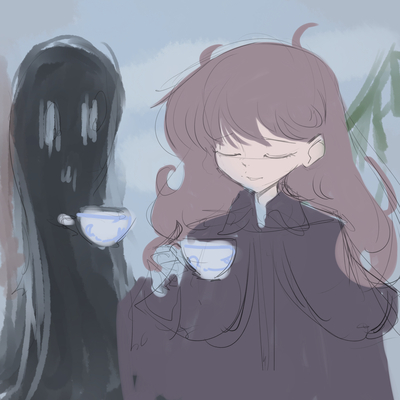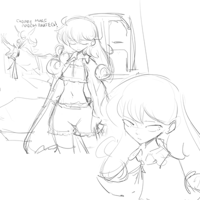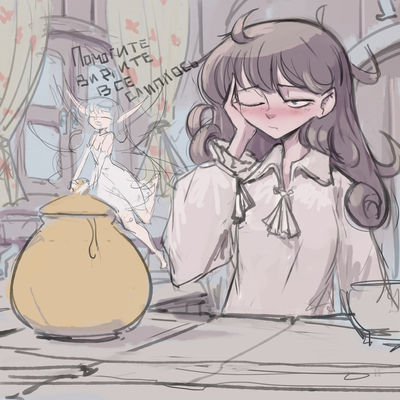 Феечка живет вместе с ведьмочкой и хорошо ее знает. Есть много набросков где ведьмочка часто закрывает глаза в рамках практики - так ей проще концентрироваться на нематериальном мире и призыве духов. Она предвкушает сам процесс. Ну а пока она не в материальном мире, свое тело она не контролирует и не всегда все проходит без происшествий.