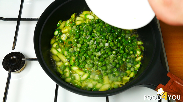 Обжариваем спаржу на оливковом масле, добавляем 200 гр зеленого горошка, снова обжариваем.