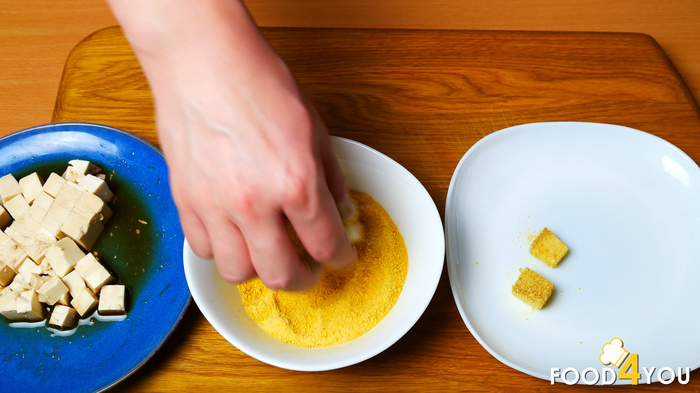 Затем берем сыр тофу(200гр), нарезаем средними кубиками и поливаем соевым соусом(50гр), вообще это желательно сделать заранее, за несколько часов до приготовления, чтоб сыр напитал весь соус.