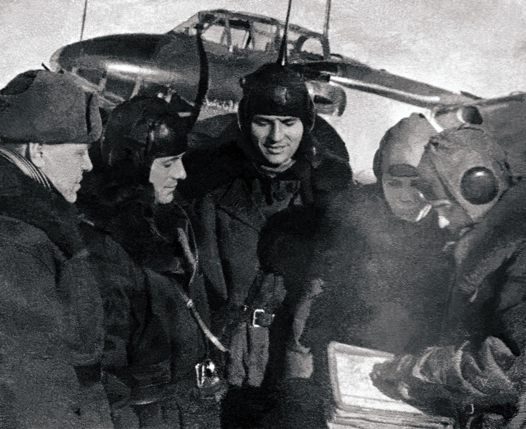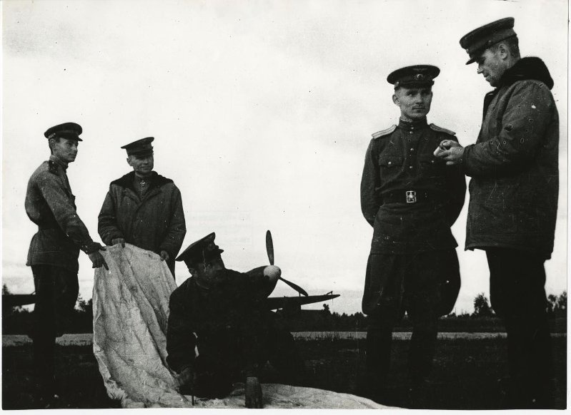 Действующая армия. Друзья обсуждают результаты полета. Штурман Павел Щербаков в центре