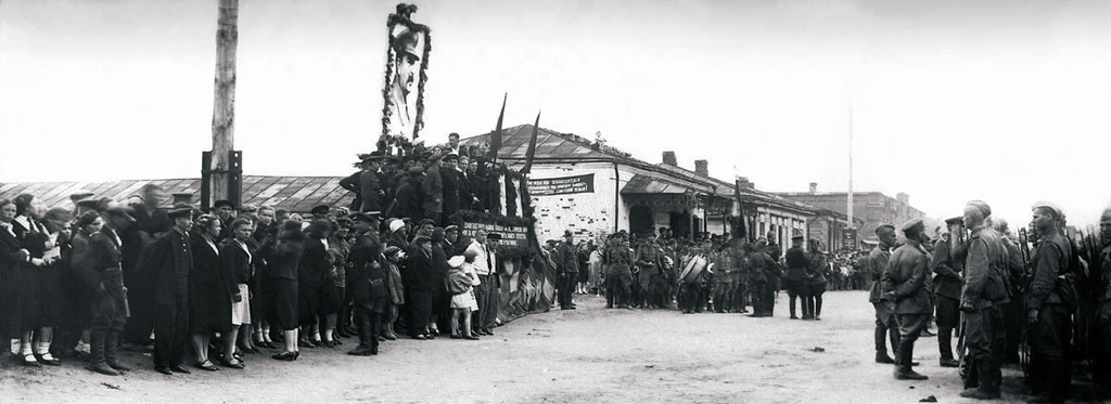 Митинг по поводу принятия присяги и отправки на фронт саперного батальона. На импровизированной трибуне А. Ф. Усталов, первый секретарь горкома ВКП(б), С. М. Толкунов, третий секретарь ГК ВКП(б), и другие. Дата съемки: июнь - июль 1943