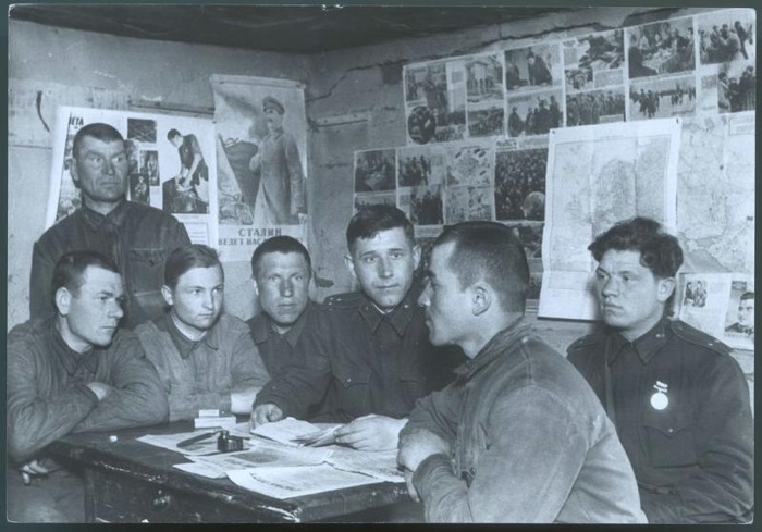 3-й Белорусский фронт. В ленинской комнате бойцы слушают агитатора.Дата съемки: 1945