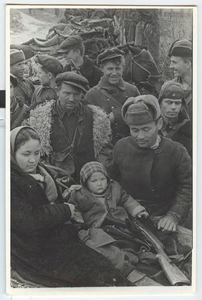 Справа на первом плане - Жилбек Агадилов с женой Жамал и дочерью Майей. Жилбек Агадилов - уроженец Казахстана. После окончания военного училища был направлен служить на западную границу в Белоруссию. В начале войны вместе с беременной женой он попал в окружение. Но Жилбеку удалось встретиться со 2-й Клетнянской партизанской бригадой Т. Коротченкова. Он командовал 2-й ротой 1-го батальона. В этом же отряде находилась и его жена Жамал. Этот случай описан в повести А. Шарипова «Огонь в лесу. Ч. 1. Дочь партизана».