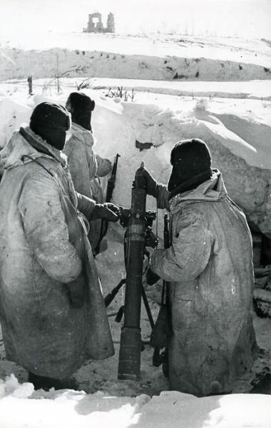 Обстрел высотки, занятой немцами. Калининский фронт. Дата съемки: 1942 год.