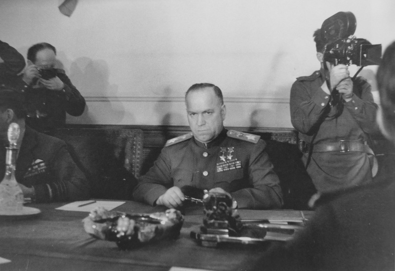 Представитель Верховного Главнокомандования Красной Армии командующий 1-м Белорусским фронтом Маршал Советского Союза Георгий Константинович Жуков во время подписания акта о безоговорочной капитуляции вооруженных сил Германии в берлинском районе Карлсхорст.