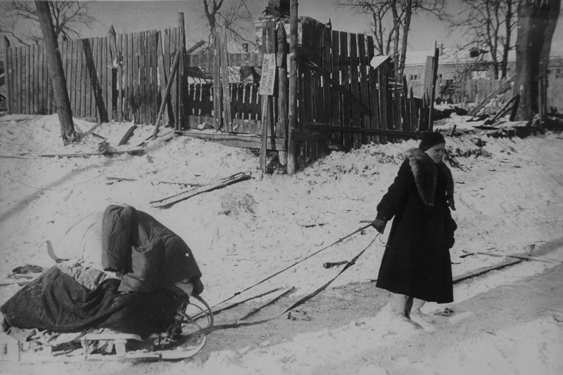 Женщина тянет санки с вещами на улице освобожденной Калуги. На углу забора висит полусбитая табличка с названием улицы на немецком и русском языке — скорее всего, с надписью «Zypulin Straße — Цыпулинская улица». Дата съёмки: 1941—1942 гг.