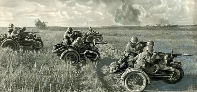Северо-Западное направление. Советские мотоциклисты идут в атаку. Ретушированное фото.