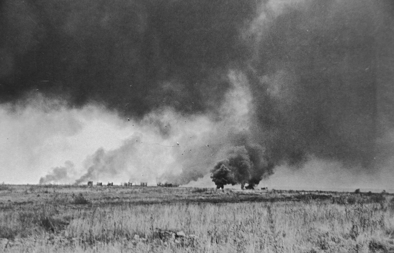 Фронтовой пейзаж с дымами на горизонте. Советско-германский фронт. Дата съемки: 1942