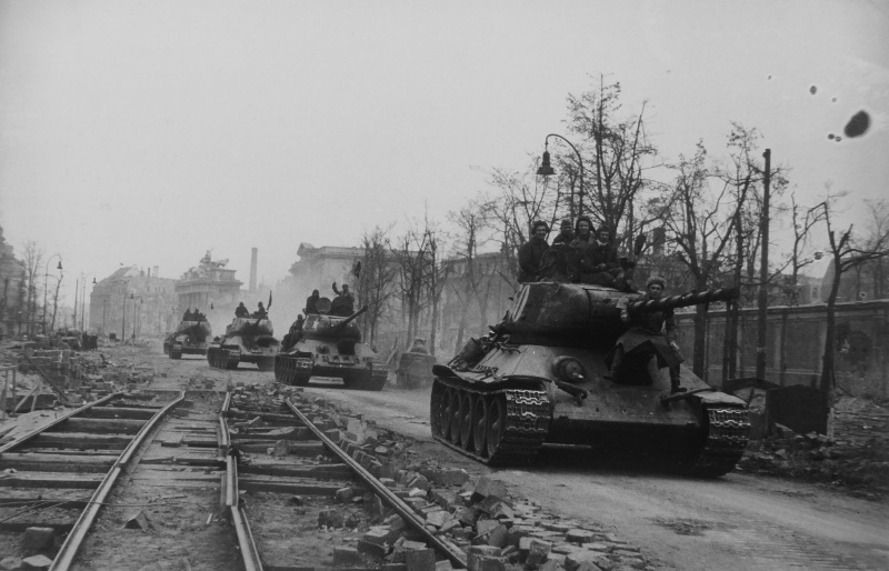 Колонна советских танков Т-34-85 на улице Герман-Геринг-Штрассе во взятом Берлине