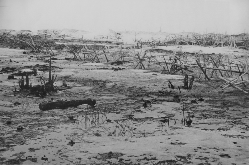 Вид на ряды колючей проволоки перед оборонительными полевыми позициями на Северо-Западном фронте. Дата съемки: 1943