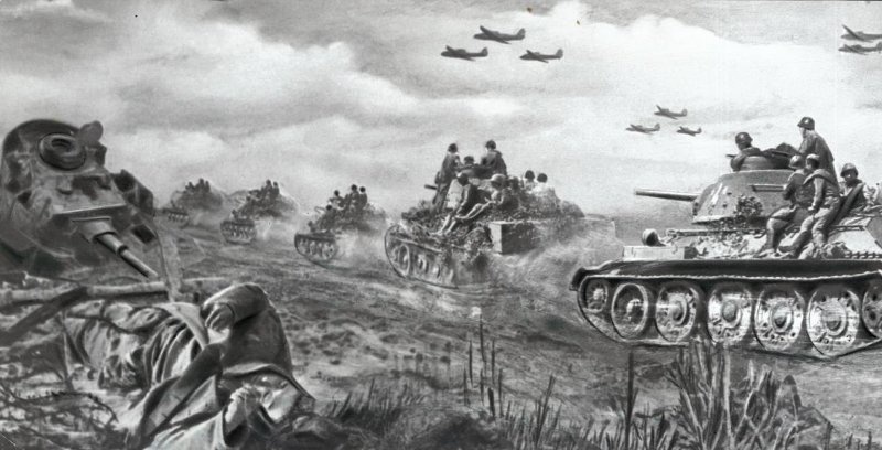 Советские танки Т-34-85 пересекают поле в районе Бреслау (ныне Вроцлав (Wrocław) в составе Польши). В небе летит пара штурмовиков Ил-2.