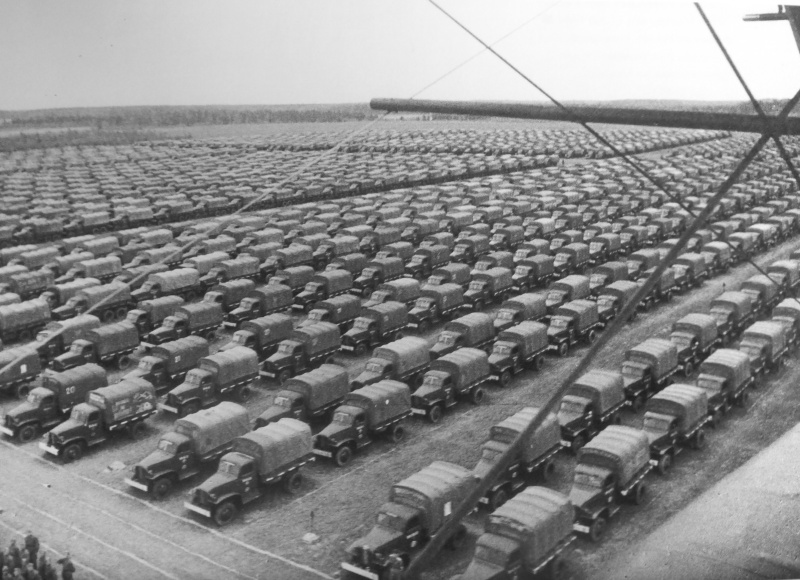 Вид с воздуха на грузовики «Шевроле» (Chevrolet G7107, находятся на переднем плане) и «Студебеккер» (Studebaker US6) из американских поставок в транспортном резерве командования Красной Армии. Место съемки: Можайск. Дата съемки: май 1944