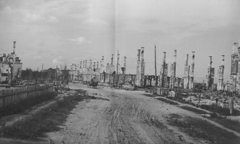 Печи сгоревших домов в освобожденном Красной Армией городе Ярцево Смоленской области.