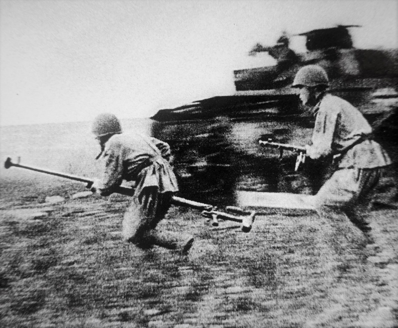 Разведчики 275-й отдельной разведывательной роты (командир — капитан Юнус Гареевич Каримов) 233-й стрелковой дивизии 53-й армии Степного фронта, в летних маскировочных костюмах бегут мимо немецкой САУ Мардер III (Marder III), окутанной клубами дыма, во время боев в Полтавской области. Дата съемки: сентябрь 1943 г.