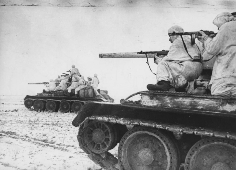Бойцы танкового десанта на танках Т-34 в наступлении на Сталинградском фронте.