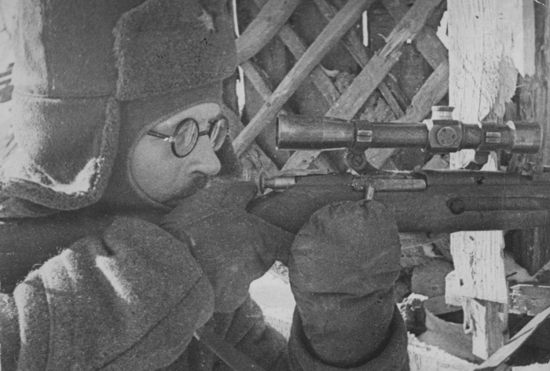Снайпер 42-го гвардейского стрелкового полка 13-й гвардейской стрелковой дивизии красноармеец Никонор Федорович Щеткин (1907—1942) ведет наблюдение во время боев в Сталинграде. Погиб в Сталинграде 26.11.1942 года. Дата съемки: ноябрь 1942 г.