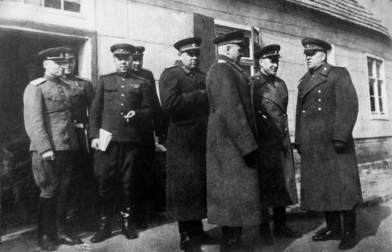 Маршал Советского Союза Георгий Константинович Жуков (1896—1974, справа) с высшими советскими офицерами в Карлсхорсте. Согласно другим данным, снимок появился в деревне под Шнайдемюлем (Schneidemühl, ныне Пила в Польше). Дата съемки: 08.05.1945 г.