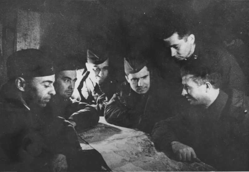 Герой Советского Союза командир 13-й гвардейской стрелковой дивизии генерал-майор Александр Ильич Родимцев (1905—1977, крайний справа) с подчиненными у карты в штабе.