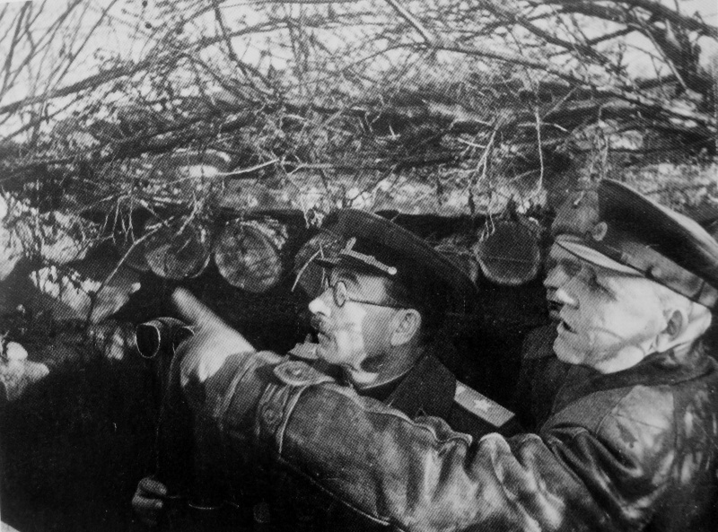 Командующий 2-м Украинским фронтом маршал И.С. Конев (1897 — 1973) и командующий 5-й гвардейской танковой армией маршал бронетанковых войск П.А. Ротмистров (1901 — 1982) на наблюдательном пункте. Дата съемки: 1944 г.