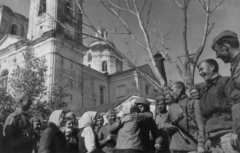 Бойцы 1-го Прибалтийского фронта разговаривают с жителями освобожденного Полоцка у Свято-Николаевского собора. Дата съемки: июль 1944 г.