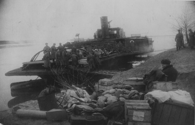Бойцы 64-й армии грузят продовольствие и боеприпасы на паровой колесный буксир у южной переправы напротив поселка Красноармейск в Сталинграде. Дата съемки: ноябрь 1942 г.