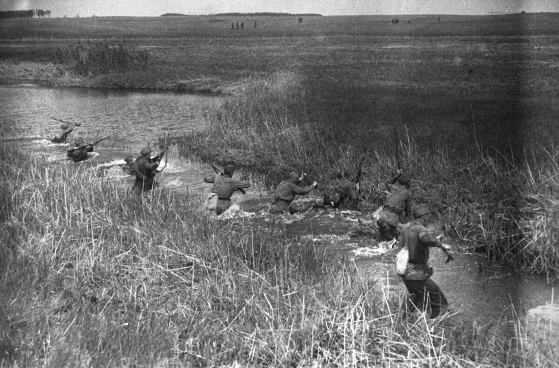 Бойцы РККА с винтовками преодолевают водную преграду. Дата съемки: 1942-1943 гг.