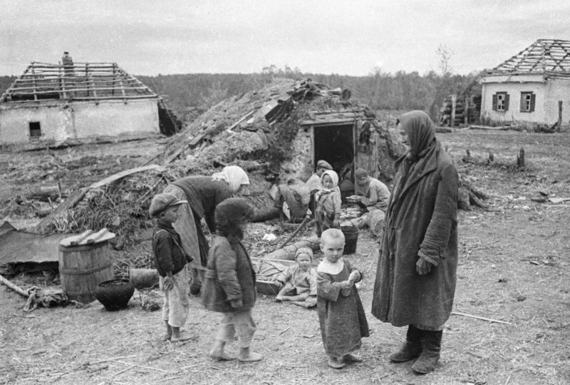 Женщины с детьми у землянки в разрушенной советской деревне. Дата съемки 1942-1943 гг.