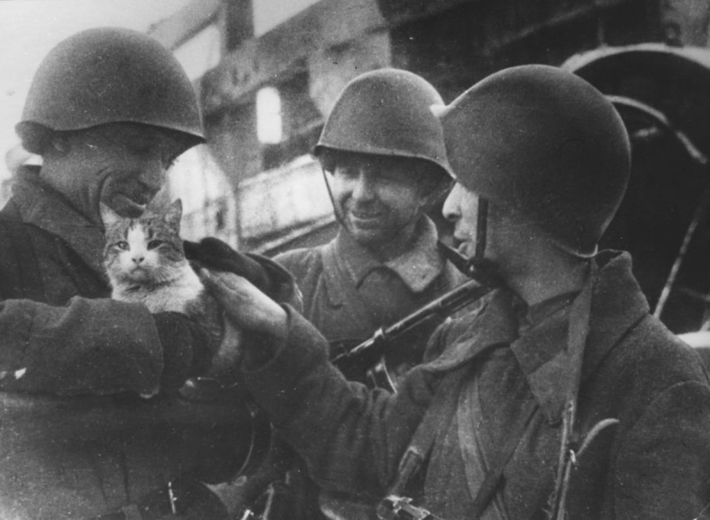 Из воспоминаний автора фотографии Якова Рюмкина: «В те дни Сталинград стал мёртвым городом – даже птицы не летали и вдруг – кошка! Живая, Бог знает, как уцелевшая. Среди руин и печных труб она казалась чудом. Пушистый комочек словно хранил тепло родного очага. Солдатские руки, много месяцев не выпускавшие винтовку, бережно потянулись к ней, к этому символу жизни. Такой далёкой и почти забытой. Чуть ли не до драки спорили – у кого будет жить кошка. Её отвоевали бойцы полка Долгова (13 гв. стрелковая дивизия)». Дата съемки: 1942 г.
