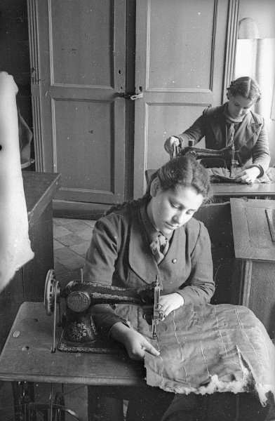 Московские пионерки Тая Горохова и Люся Исаева в Московском доме пионеров шьют телогрейки для фронтовиков. Дата съемки: 1942 год