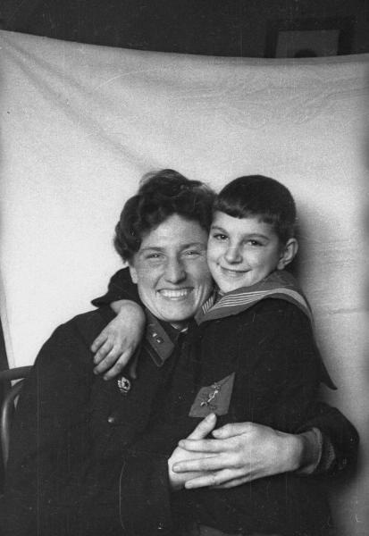Летчик-истребитель Екатерина Буданова с мальчиком. Дата съемки:февраль 1943