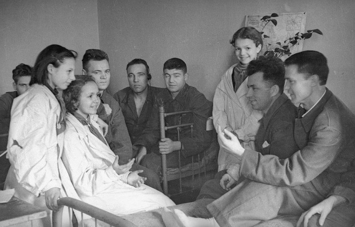 «Пионеры 635 школы работали в N-ском госпитале. Володя Герасимов читает раненому бойцу Я. И. Резичкину свежий номер газеты "Правда"».