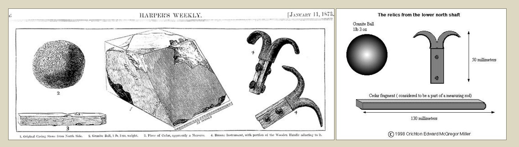 Каменный шар, который был найден в северной шахте Камеры Царицы, мог предназначаться для проверки функциональности вентиляционного канала и даже для его прочистки. А может, орудие труда просто случайно уронили в шахту. Найденный крюк мог относиться к маневрам внутри этой системы. Петли на дверцах нужны были для удобства фиксации или перемещения заслонок, как при помощи рук, крюка, так и при помощи канатов. Продольные следы на стенках шахты могут свидетельствовать о перемещении заслонки с нижней блокировочной позиции к верхней. Следы раствора — о местах фиксации дверец. В пирамидах в большинстве случаев все коридоры, шахты и помещения отделаны достаточно хорошо, то почему бы не сделать важную для длительных и необходимых работ внутри строения вентиляцию на должном уровне? Кроме того, обработанная поверхность лучше сохранится от воздействия эрозии.