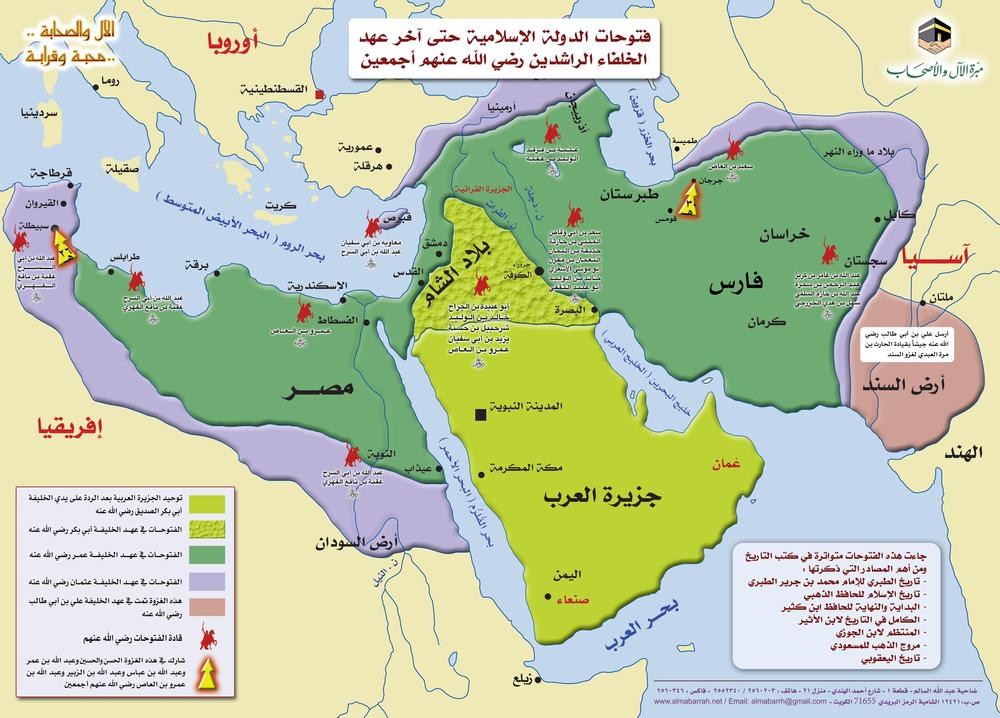 Кампания в Леванте 634-638 гг. и победа в битве при Ярмуке принесла арабам почти все территории Палестины и Сирии, включая Иерусалим и Антиохию. На фронте с Ираном победы арабов в битвах при Кадисии (636) и Нехавенде (642) привели к полному упадку Государства Сасанидов и присоединению к Халифату Месопотамии и запада Ирана. Присоединение оставшейся части бывшей могучей империи к владениям мусульман стало вопросом времени. В 639 году арабы вторглись в Египет, и в 641 (или 642) сдалась Александрия. На севере арабы дошли до Кавказа.