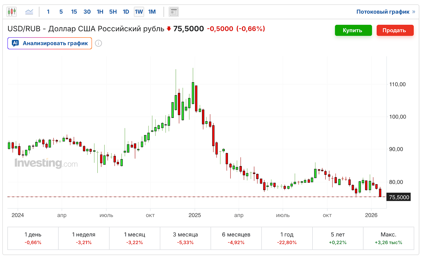 Эксперты опять облажались, а великий рубль укрепился. Изменение за неделю: 78,62 → 75,5 ₽ за доллар (курс ЦБ 77,83 → 75,92). Юань 11,15 → 10,85 (ЦБ 11,15 → 10,87). С 2023 года такого курса не было.