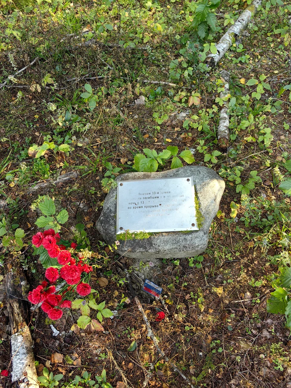 Постепенно дорога стала хуже. Появились следы тяжёлой техники, влажные колеи. В какой-то момент я понял, что дорога уходит в сторону и я сошёл с маршрута. Пришлось возвращаться и искать своё направление. Направлением оказались примерно пять–семь километров пешком среди зарослей, лосиных мух и постоянного отмахивания от них. Где-то среди этой глуши обнаружился памятник павшим воинам - табличка на камне.