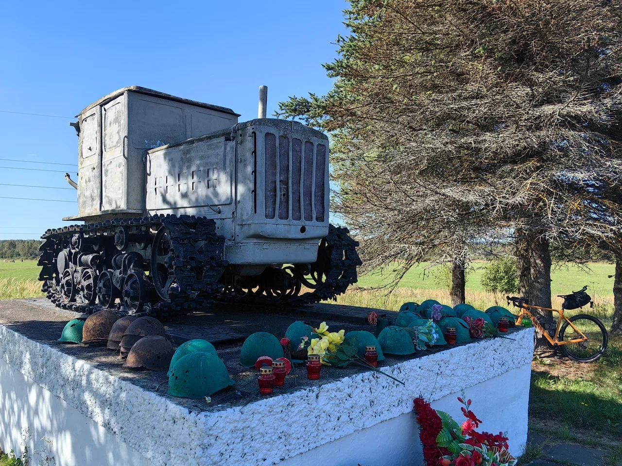 Через тринадцать километров показался мемориал Поле Памяти в честь советских солдат и мирных жителей, погибших в октябре 1941 года. Я ненадолго остановился, почитал таблички памятников и снова покатил дальше.