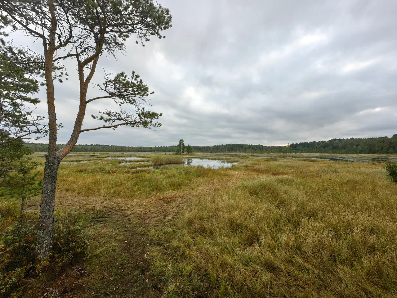 Следующим было Галкинское болото, особо охраняемый памятник природы, Крупнейшее верховое болото Калужской области, где гнездятся редкие птицы. Под хмурым небом оно выглядело особенно антуражно: серая вода, пожухлая трава и тишина.
